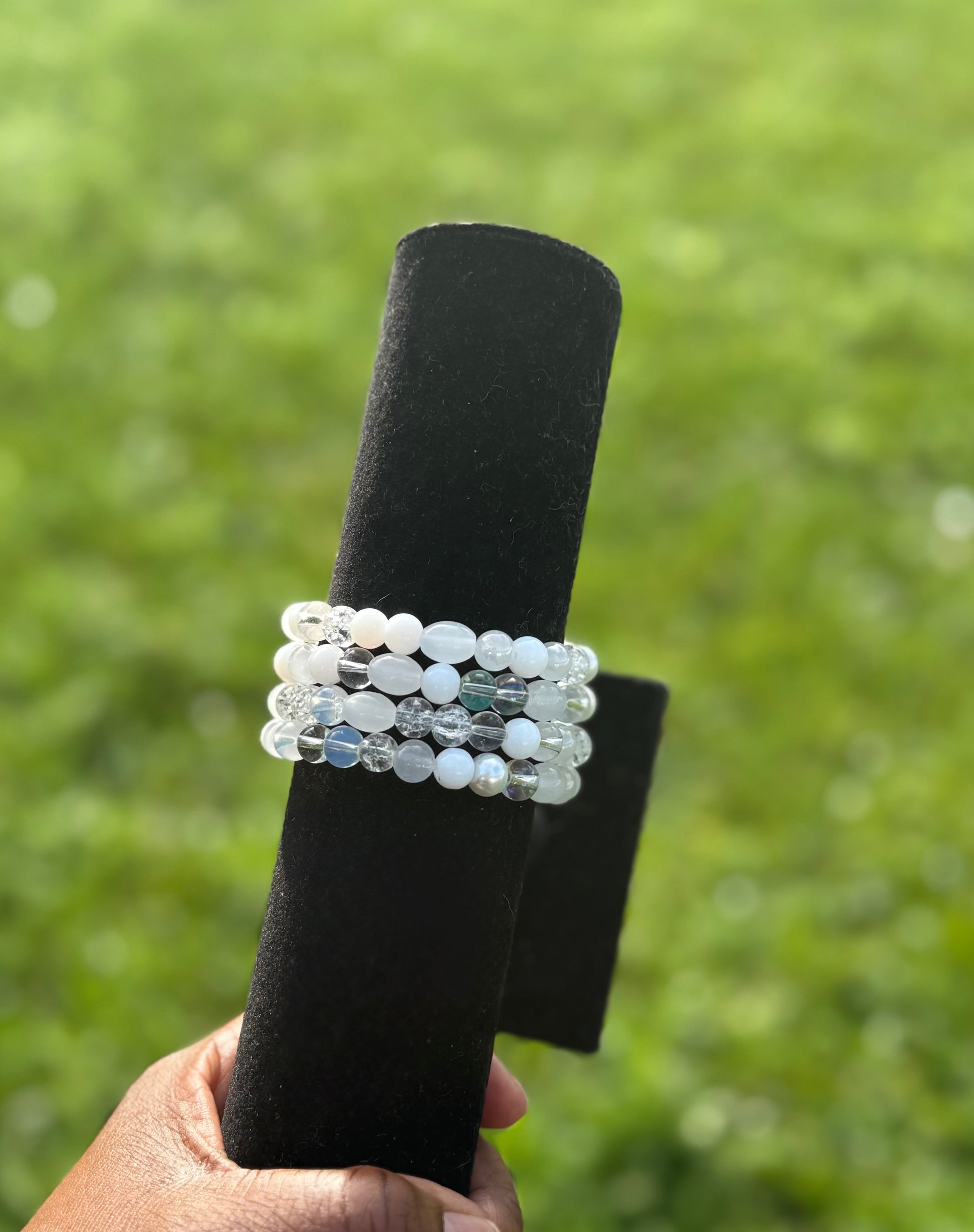 A blend of frosted whites, pearls, and clear crystal beads. This bracelet embodies peace, clarity, and balance. While it's designed to inspire calm energy and spiritual alignment, its meaning is yours to define—wear it as a reflection of your own intention, journey, and personal story.
